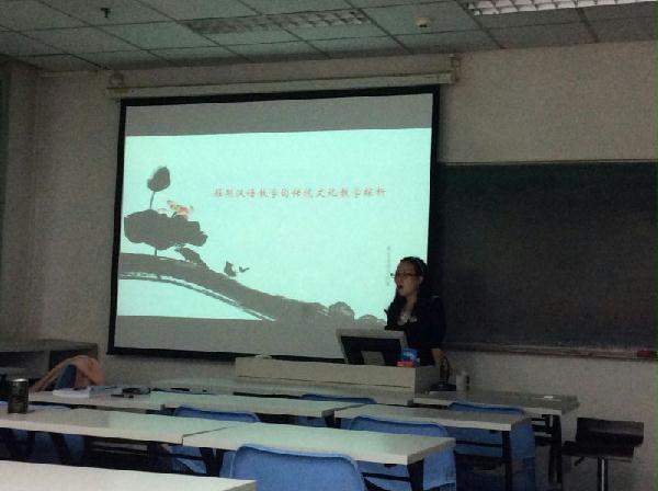 11月5号下午,国际汉语教学研究基地系列学术沙龙2015年下半年第三讲在北京语言大学教一楼619教室举行,基地驻所人员刁文慧博士做了题为“短期汉语教学的传统文化教学探析”的学术报告。报告由基地副主任梁彦民副教授主持,基地研究人员、汉语教师、研究生等参加了此次讲座。