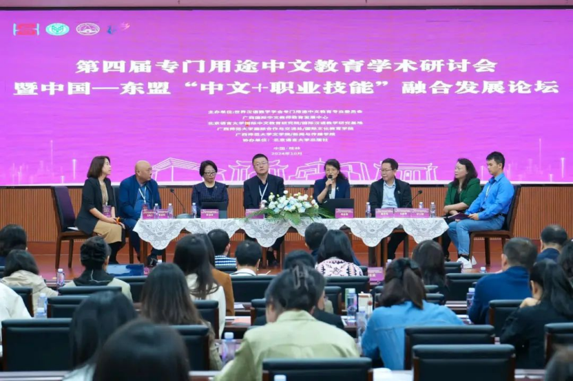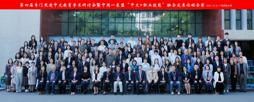 10月25—27日,第四届专门用途中文教育学术研讨会暨中国-东盟“中文+职业技能”融合发展论坛在广西师范大学召开。本次会议由世界汉语教学学会专门用途中文教育专业委员会、广西国际中文教师教育发展中心、北京语言大学国际中文教育研究院/国际汉语教学研究基地、广西师范大学国际合作与交流处/国际文化教育学院、广西师范大学文学院/新闻与传播学院、北京语言大学出版社联合举办,来自全国80多所院校和3家企业的150多位专家学者、企业负责人及高校师生参加了本次大会。