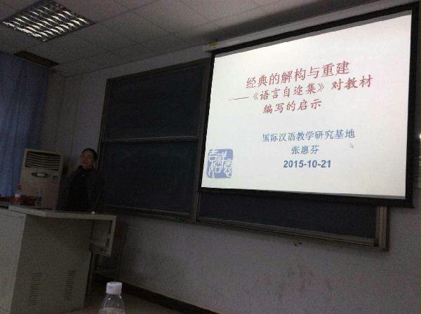10月21日下午,国际汉语教学研究基地系列学术报告在北京语言大学教四楼108教室举行,国际汉语教学研究基地驻所人员张惠芬副教授做了题为“经典的解构与重建——《语言自迩集》对教材编写的启示”的学术报告。报告由国际汉语教学研究基地副主任梁彦民主持,基地研究人员,其他院系教师、我校研究生等参加了此次报告会。