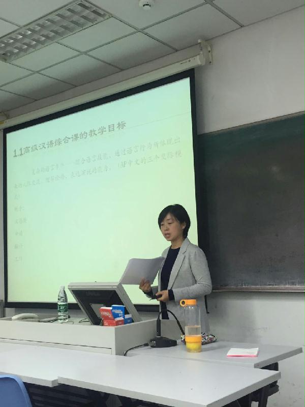 11月11日下午,国际汉语教学研究基地系列学术讲座2015年下半年第四讲在北京语言大学教一楼619教室举行,基地驻所人员于天昱博士做了题为“任务型教学理念在高级汉语教学中的实践与思考”的学术报告。报告由基地主任姜丽萍教授主持,基地研究人员、汉语教师、研究生等参加了此次讲座。